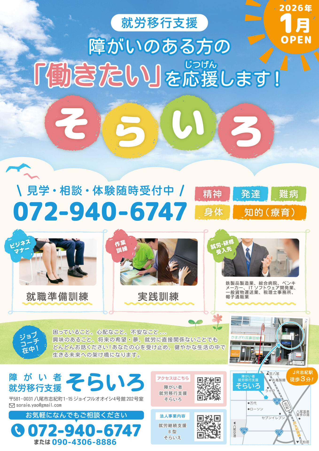 JR関西本線「志紀駅」徒歩3分にある『就労移行支援そらいろ』は、