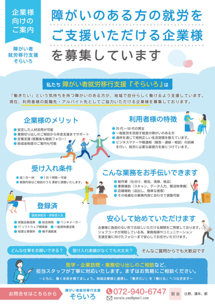 八尾市周辺地域の会社様や事業者様にも多数研修先や就労先として受け入れて頂き、ありがとうございます。